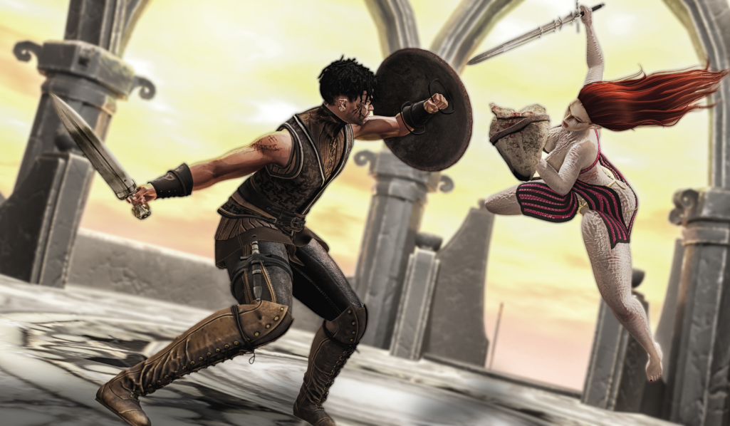 State intent in your post before your roll. To attack another character, use either the middle or bottom left-hand button beside the HUD. The middle (double dice) will roll against another player without damage (for a luring song, a sleeping gas, hypnosis, seduction, etc), while the bottom (sword icon) will roll against with damage for an actual attack. Once HP is depleted, that’s the end of the fight. It doesn’t have to mean you’re dead, just down and out!​